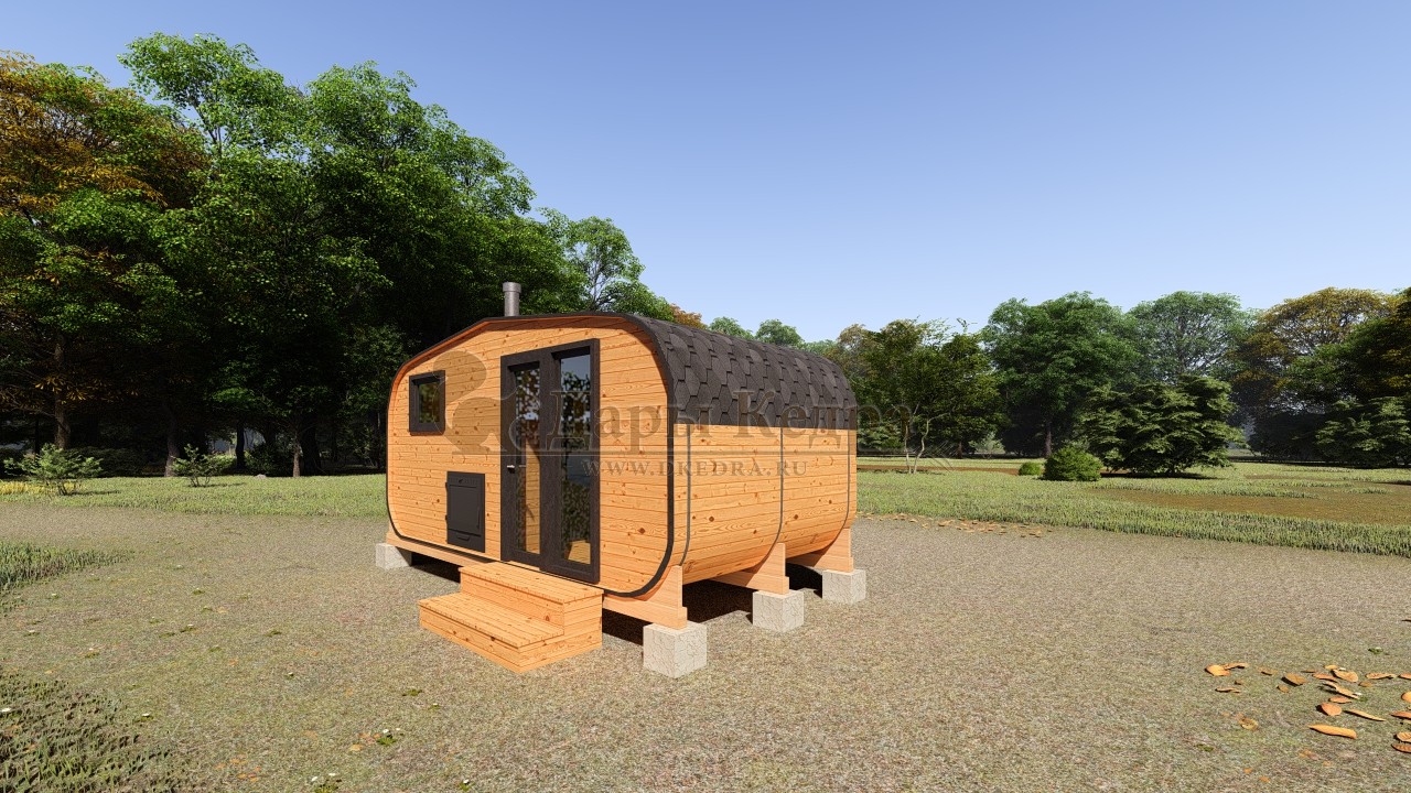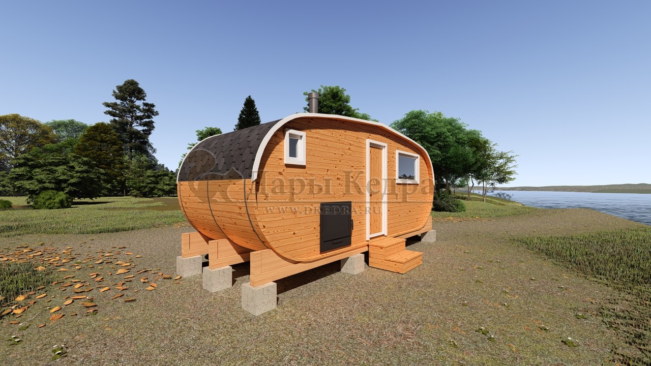 Баня-бочка буханка из кедра с козырьком (все размеры) Баня-буханка более просторная за счет увеличенной высоты потолков и ровного пола. Козырек не только украшает баню, но и защищает оставленную обувь от дождя. Лавочки из кедра находятся по всей длине бани-бочки с обеих сторон. Печь расположена в парилке около дальней стены. Время растопки такой бани не превышает 30 минут. В зависимости от выбранного размера баня-бочка буханка с козырьком имеет следующую комплектацию: Баня-бочка буханка 2,5 метра - парилка; Баня-бочка буханка 3,5 и 4,5 метра - раздевалка, парилка; Баня-бочка буханка 5,5 метров - раздевалка, парилка, моечная. По вашему желанию ее можно укомплектовать печью с внешней загрузкой, благодаря которой весь мусор вовремя топки остается на улице. Баня-бочка буханка не требует полноценный фундамент, поэтому при необходимости ее можно перенести в другое место. Обращаем Ваше внимание, что в стандартную комплектацию бани входят полки открытого типа в парной с обеих сторон. Дополнительно можно заказать полок закрытого типа или лавку! Кедр обладает ароматическими свойствами. Он не деформируется и влагоустойчив, при правильном уходе за деревом на нем не развиваются грибки и плесень.