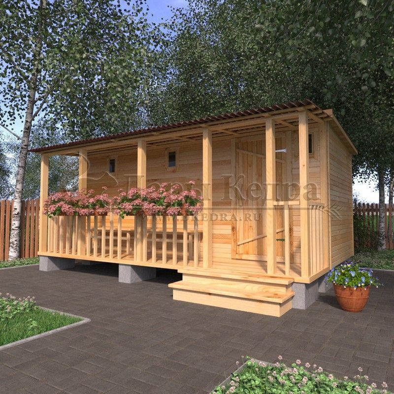 Каркасно-щитовая баня из кедра «Макси» с верандой Это классическая прямоугольная модель бани с тремя отделениями: предбанником, моечной и парилкой. Для удобства пользования предбанник оснащен лавочкой и вешалкой. В моечной находится лавка и полочка из кедра. Парилка оборудована двухуровневым открытым полком и печью. Время растопки такой бани не превышает 30 минут. На просторной веранде можно оставить вещи или отдохнуть после парения. Каркасно-щитовую баню можно заказать как в готовом, так и в разборном варианте. В разборной модели готовые щиты из кедра быстро собираются в полноценное строение, что также позволяет исключить лишний строительный мусор. Такая баня не требует полноценный фундамент, поэтому при необходимости ее можно перенести в другое место. Обращаем Ваше внимание, что в стандартную комплектацию бани входит полок открытого типа в парной. Дополнительно можно заказать полок закрытого типа или лавку! Древесина кедра насыщена эфирными маслами и фитонцидами, которые активируются при воздействии температур. Таким образом, парение в каркаско-щитовых банях из кедра становится еще полезнее.