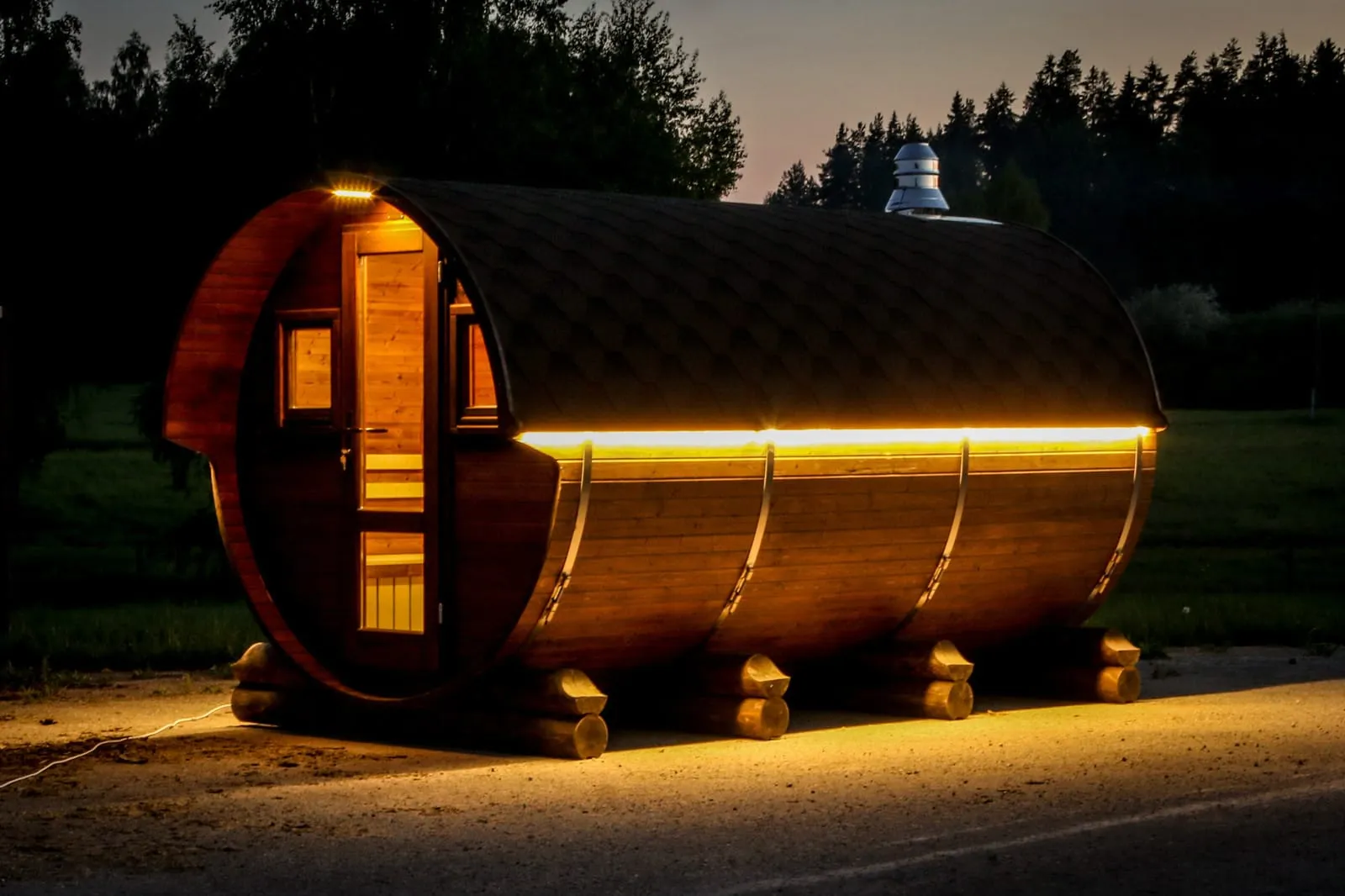Стильная и современная баня-бочка может быть выполнена длиною от 3 метров, что-бы парильное отделение было не менее 2,5 метров для безопасного расстояния человека от печи. Полок одноуровневый, что позволяет в полной мере наслаждаться видом из панорамного окна. Печь идёт с внутренней топкой по центру, её можно установить сбоку с топкой внутри, снаружи, либо вынести топку в соседнее отделение. Печь можно укомплектовать баком для воды, а саму баню сделать длиною до 6 метров, комфортно разместив в ней дополнительно помывочную и комнату отдыха.