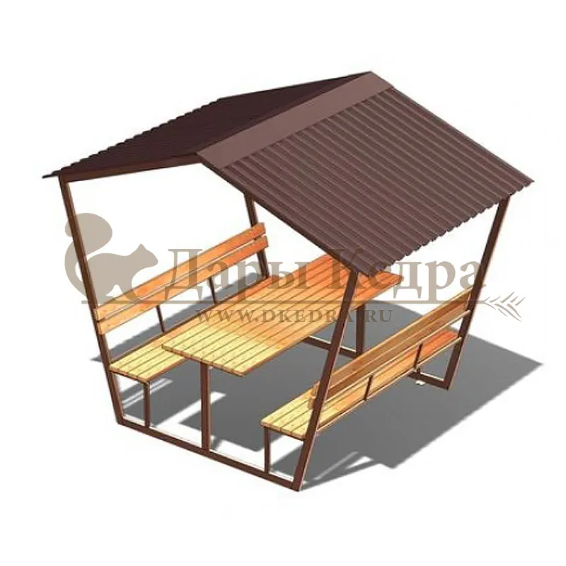 Беседка из металла Беседка выполнена из стальной квадратной профильной трубы 40х40 мм. Лавки и стол обшиты кедровой доской. На крыше - ондулин. Беседка отличается простотой в установке, легкостью конструкции, долговечностью, прочностью и классическим дизайном, который впишется в любой интерьер приусадебного участка. Вокруг такой беседки можно организовать ландшафт из вьющихся растений, которые красиво создадут зеленые 'стены' снаружи и уют внутри. Размер стола у разных моделей варьируется в зависимости от ширины конструкции.
